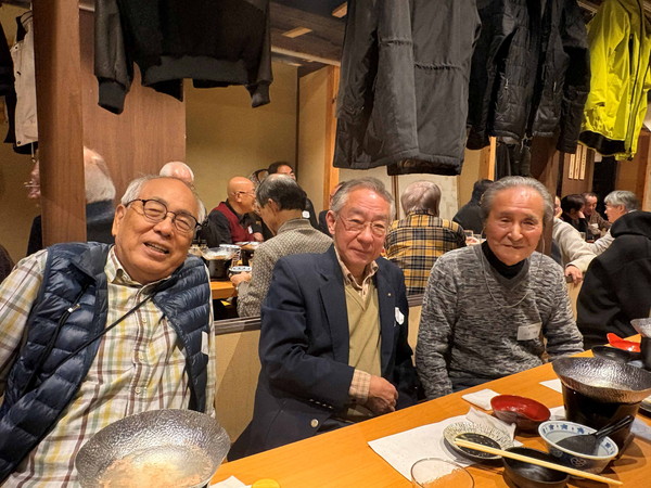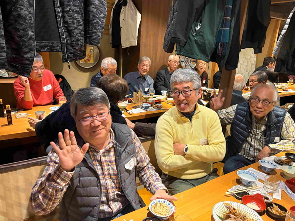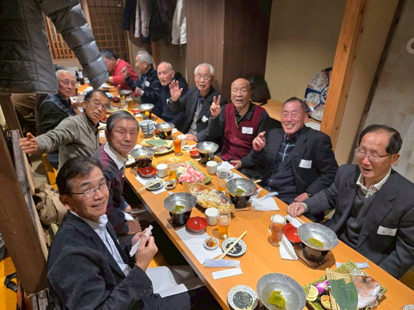 1月25日に博多駅近くの「玄海亭本店」で、北東地区と南東地区の合同新年会を行いました。 初めての合同開催で、北東地区24名、南東地区16名の計40名の大所帯での開催でした。 北東地区の森さんと南東地区の株元さんの挨拶で始まりました。 会場が少し手狭だったため配膳が大変でしたが、皆さん協力して飲み物や料理など届け合い、また動き回り、 かえって肩を寄せ合う距離感で歓談が弾みました。 南東地区の方々とは会う機会が少ないので、本当に久しぶりの方など、懐かしい思い出話に花が咲きました。 いつもの新人の紹介や、近状報告など全くできないほど、盛り上がりました。(申し訳ありません) 予定の2時間もとうに過ぎて、終わりのない様な感じでしたが、最後に株元さんの締めで閉会となりました。 盛り上がりすぎて、最後の集合写真の際に「松九会」の垂幕を広げるのを忘れてしまいました!(これもゴメンナサイ) 皆さんも合同開催で意気投合できたようですので、これからも他地区との親睦を深める活動を進めたいと感じました。 (レポーター 平川さん) |